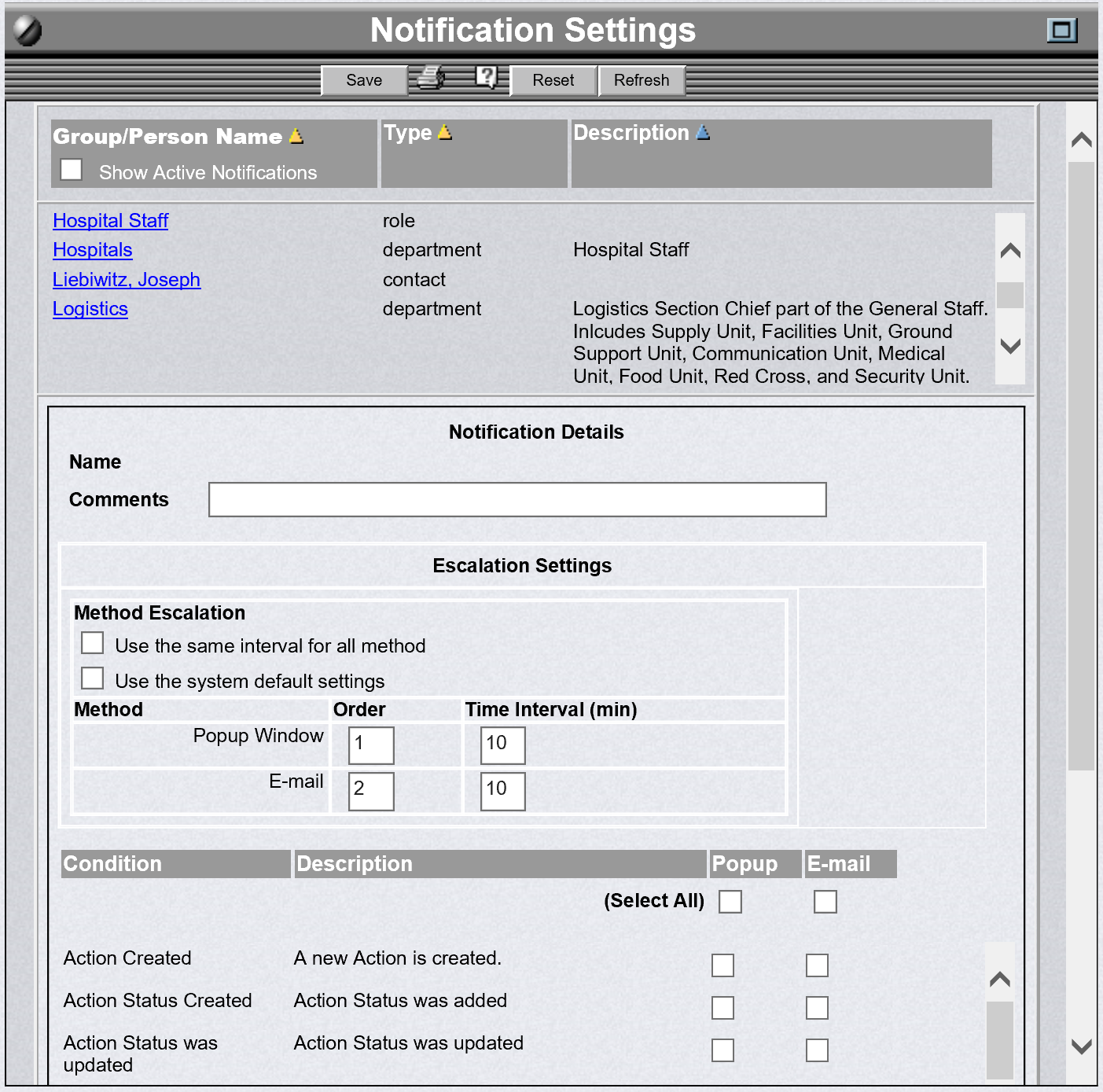 The OpsCenter system includes comprehensive notification functionality. It can automatically notify contacts, users, roles, or an entire section when a certain condition exists in the system. The system can send specific notification messages for each condition. It can send email notification messages to a cellular phone, alphanumeric pager or the user's normal e-mail inbox. It can also display a message on the screen of the appropriate users if that person is logged into OpsCenter.